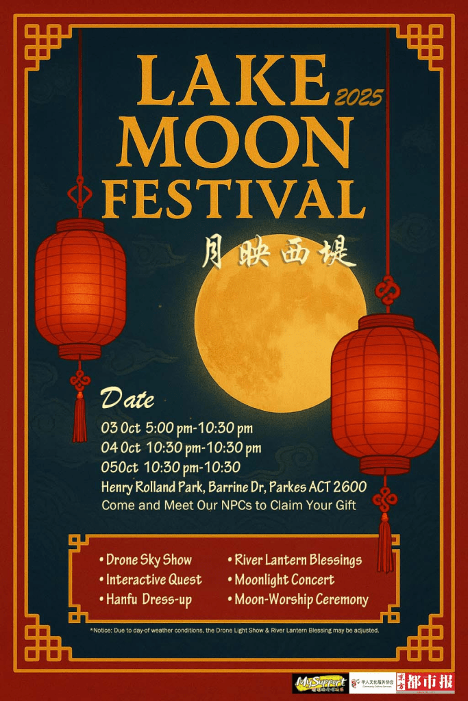 This year’s event is initiated and presented by Community Culture Services and MySupport. It’s our 5th year celebrating Mid-Autumn—and our first-ever three-day, fully outdoor edition. Highlights include a Moonlight Concert (cultural performances), River Lantern Blessing, Drone Light Show (weather permitting), Chinese attire showcase, and interactive, NPC-led experiences. We’ve adapted the traditional Mid-Autumn story into a site-wide immersive script: in-character performers (NPCs) interact with guests across themed scenes. By joining hands-on cultural activities and completing NPC quests, guests collect clues and rewards while discovering the full Mid-Autumn story. Beyond the interactive experiences, enjoy Asian food and cultural market stalls, plus write your wishes on lanterns or plaques and set them afloat for blessings of health and safety.